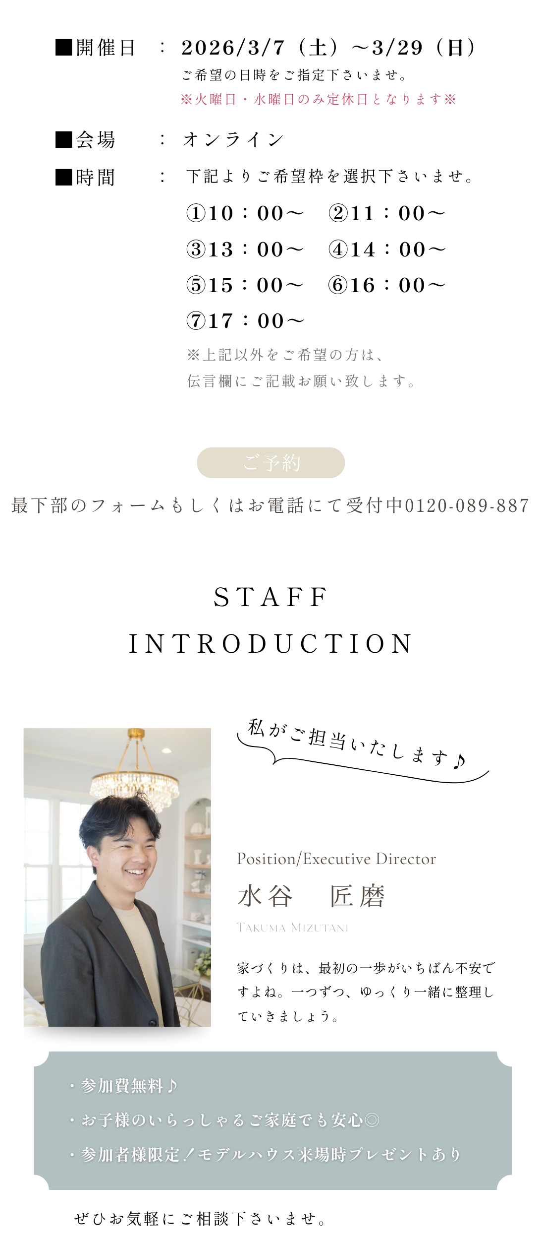 | 開催場所 | オンライン※対面をご希望の場合はモデルハウスにて実施いたします※ |